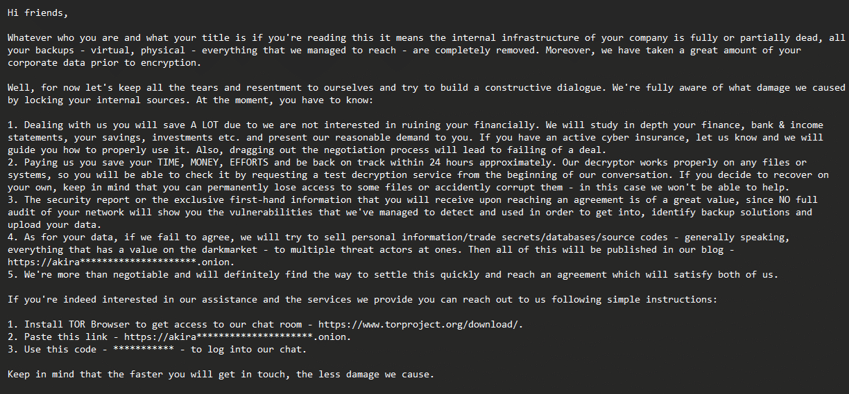 4. As for your data, if we fail to agree, we will try to sell personal information/trade secrets/databases/source codes – generally speaking, everything that has a value on the darkmarket – to multiple threat actors at ones. Then all of this will be published in our blog – https://akira*********************.onion.