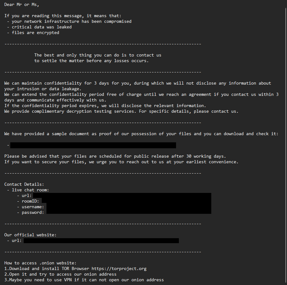 Victims are directed to one-to-one negotiation through instructions in the ransom note. Communication is conducted through Tox, and a dedicated leak site supports pressure by providing a public venue for disclosure if demands are not met.